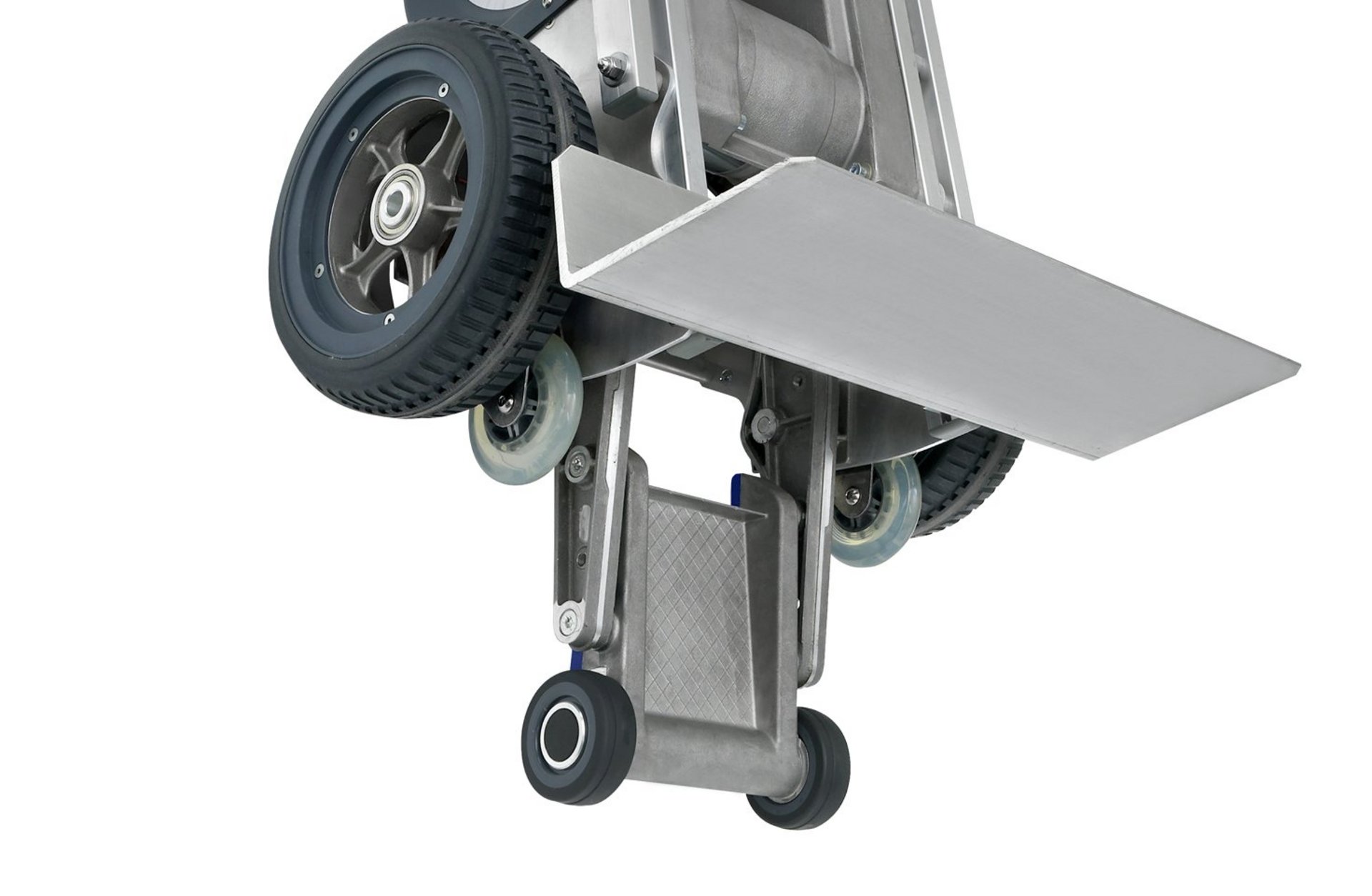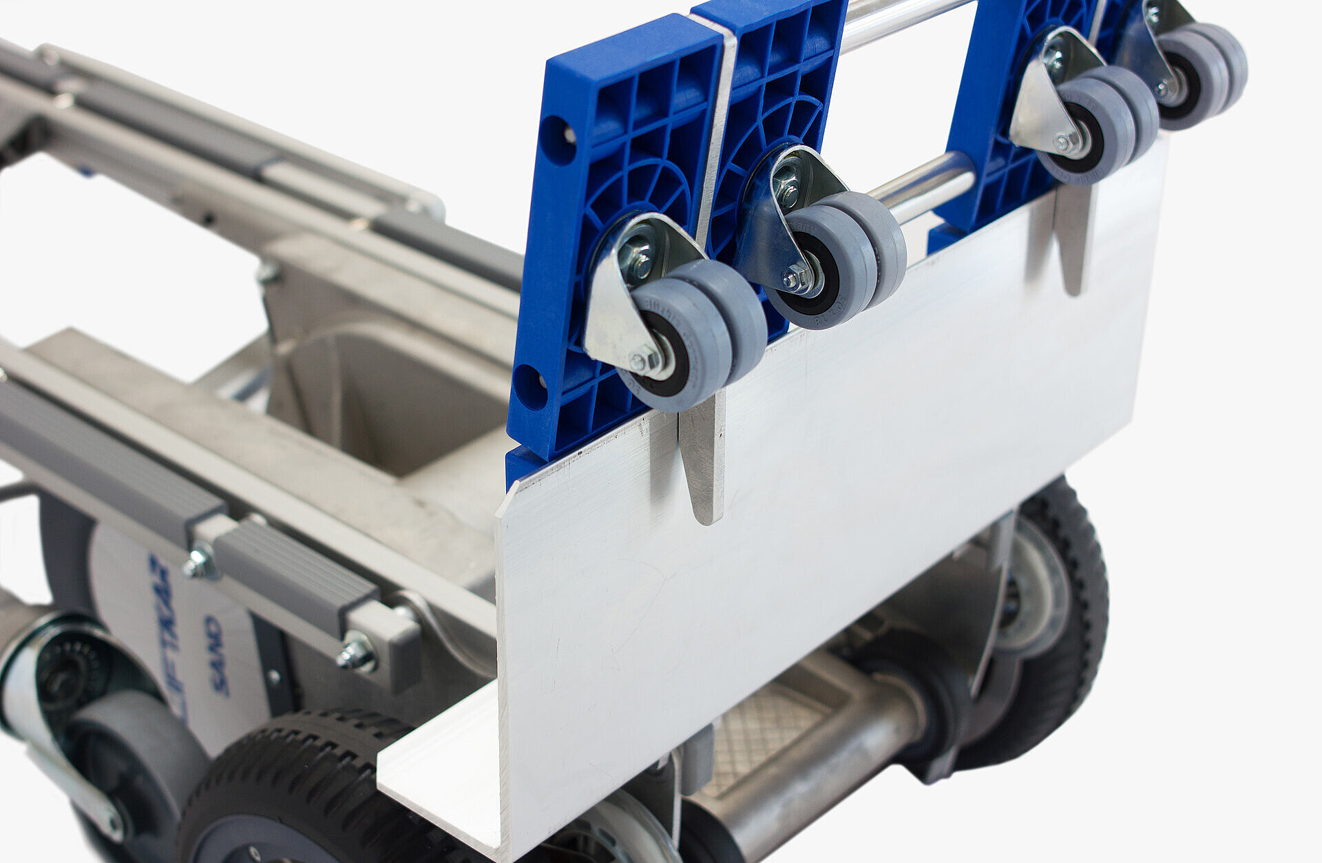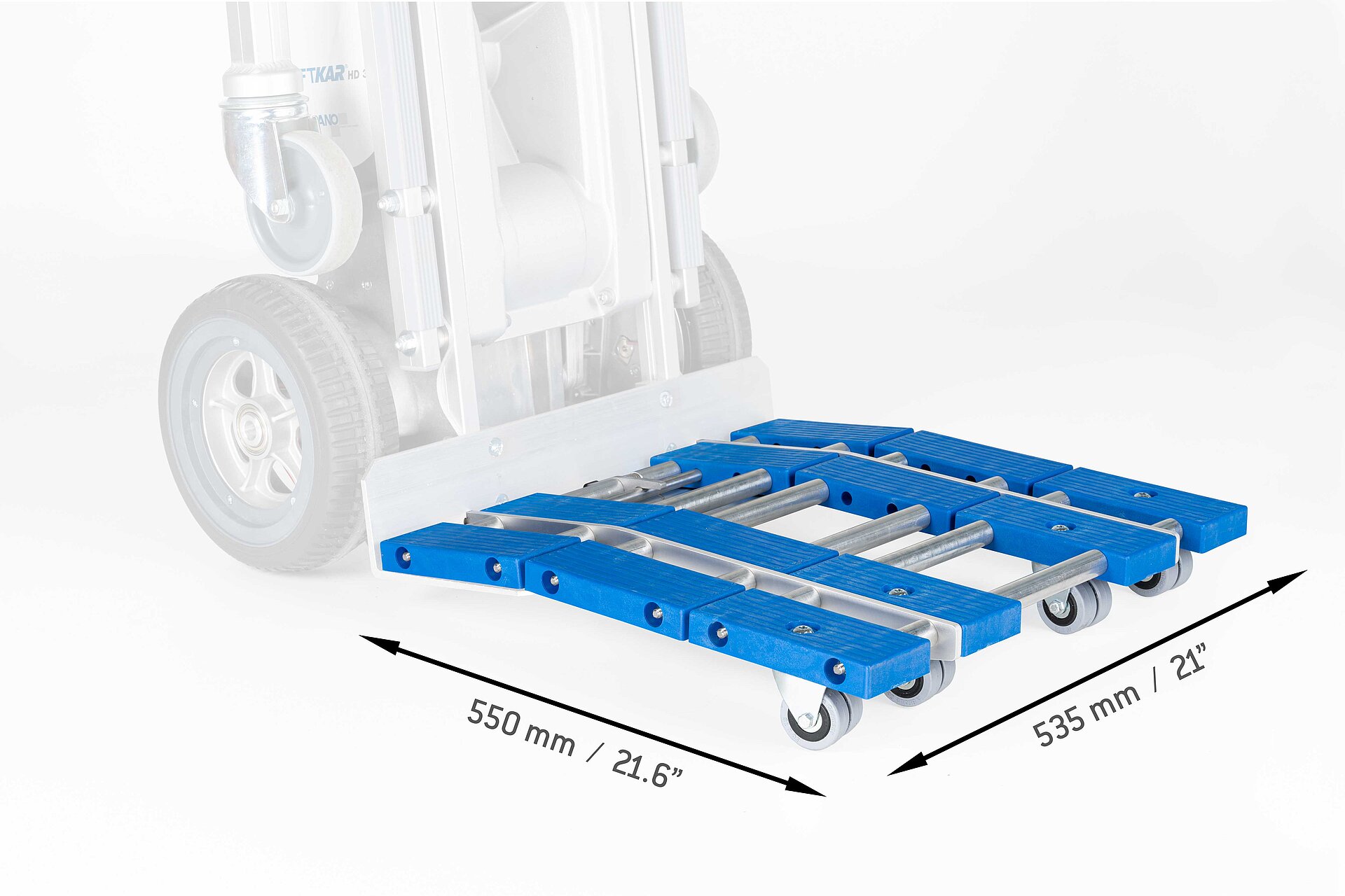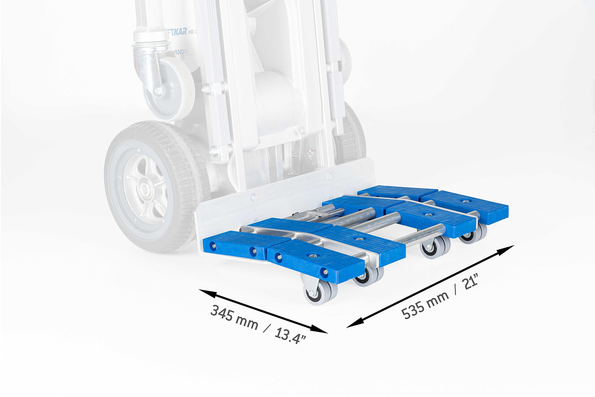 Das System lässt sich blitzschnell aktivieren: Durch Anheben des LiftKar HD und einfaches Aus- bzw. Einklappen sowie Arretieren des Dollys. So wechselt man in Sekundenschnelle zwischen Treppensteigen und Rollen auf ebenem Gelände. Beim Einsatz in der Ebene, etwa auf Baustellen oder auf Kopfsteinplaster, bewährt sich die pannensichere Bereifung mit der elastischen, profilierten Lauffläche. Die Dolly-Ausführung gibt es sowohl für das Modell UNI als auch für das Modell FOLD.