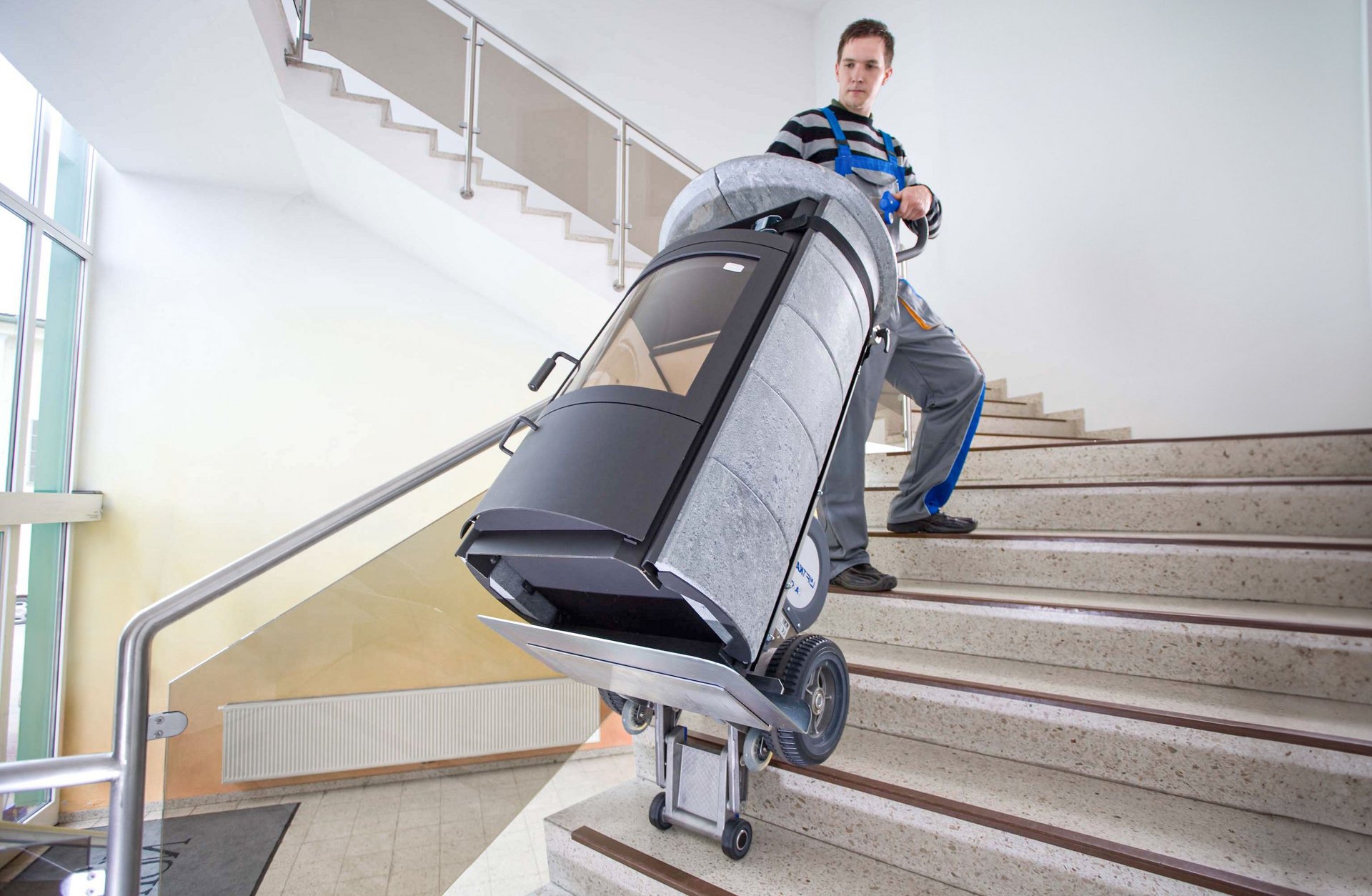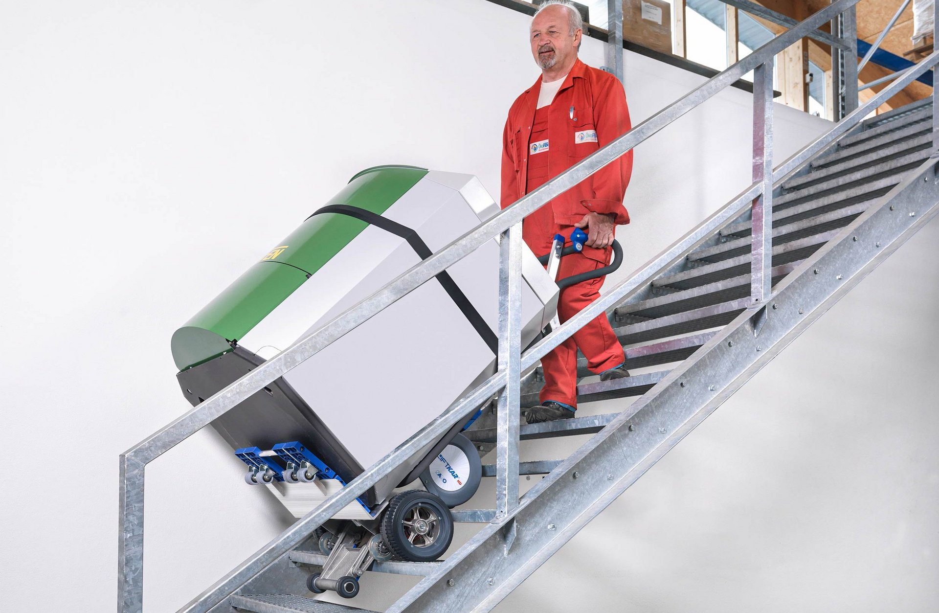 Schwere Lasten sind schwierige Lasten. Ganz besonders beim Transport über Treppen. Rücken und Gelenke werden stark beansprucht und Unfälle können passieren. Oft müssen zwei oder sogar drei Leute kräftig mit anpacken, mit dem LiftKar HD kann eine Person schwere Lasten schnell und sicher über Treppen transportieren. Vom schweren Heizkessel über Weißware bis hin zu dicken Linoleumrollen - mit dem LiftKar HD meistern Sie Transportprobleme zuverlässig, souverän und rasch. Der elektrische Treppensteiger von SANO ist ideal für den Einsatz in Transport- und Logistikunternehmen, Handel, Gewerbe und Industrie.