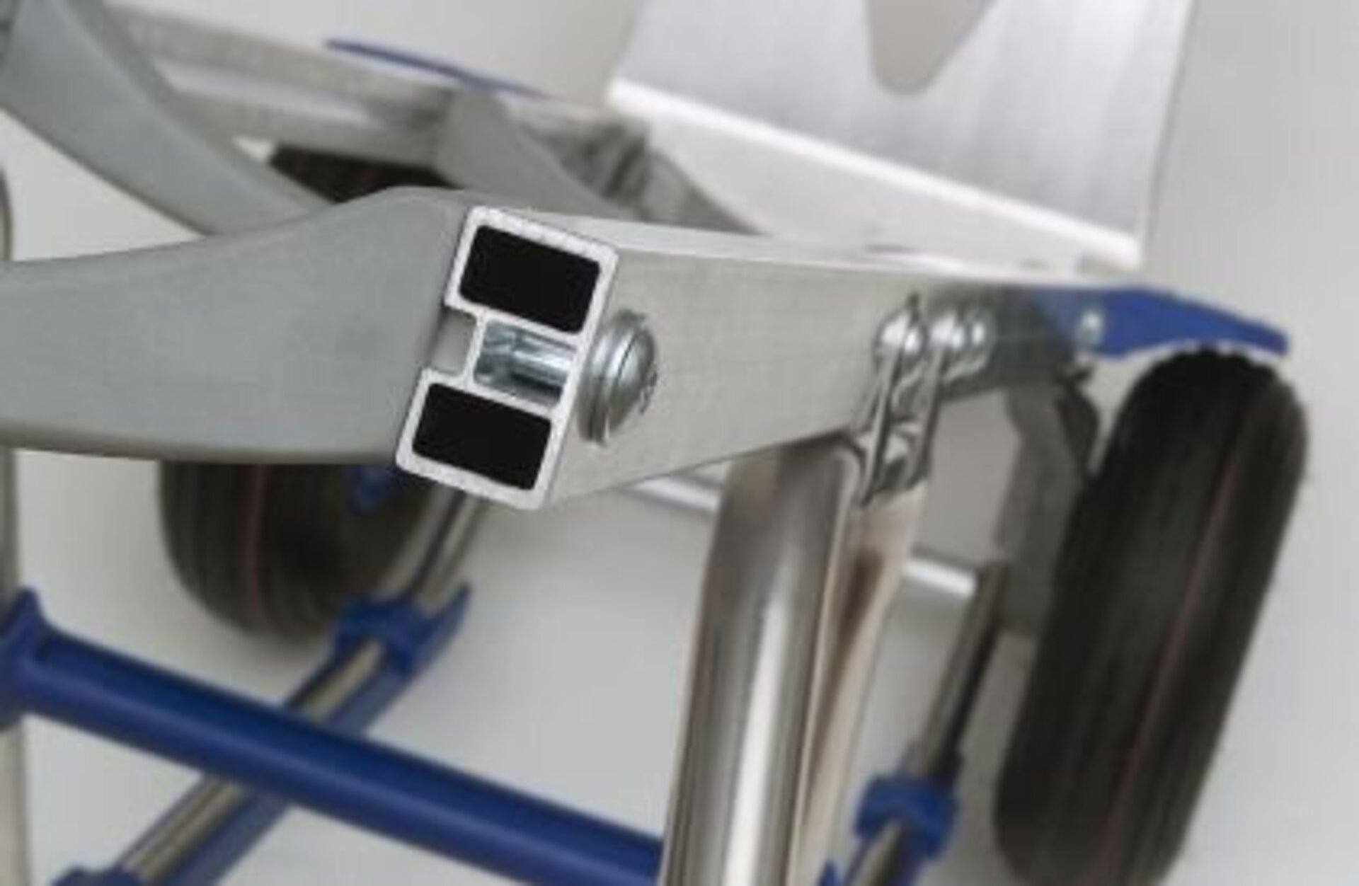 Der patentierte Profilquerschnitt mit doppeltem Mittelsteg ermöglicht das Durchschrauben. Die Innennut gibt Stabilität. Die extrem starke Radaufhängung in Kombination mit der nur 8 cm vom Boden entfernten Zwischenachse erleichtert das Ankippen. Da am Hauptrahmen überall die gleiche TORX Schraube verwendet wird, ist nur ein Schlüssel erforderlich!
