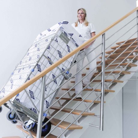 Gracias a su empuñadura especialmente ergonómica, el modelo LiftKar SAL ERGO le permite mantener una postura erguida en las escaleras y, por tanto, un control máximo sobre la mercancía transportada. Ideal para barriles de cerveza, pilas de neumáticos, etc.