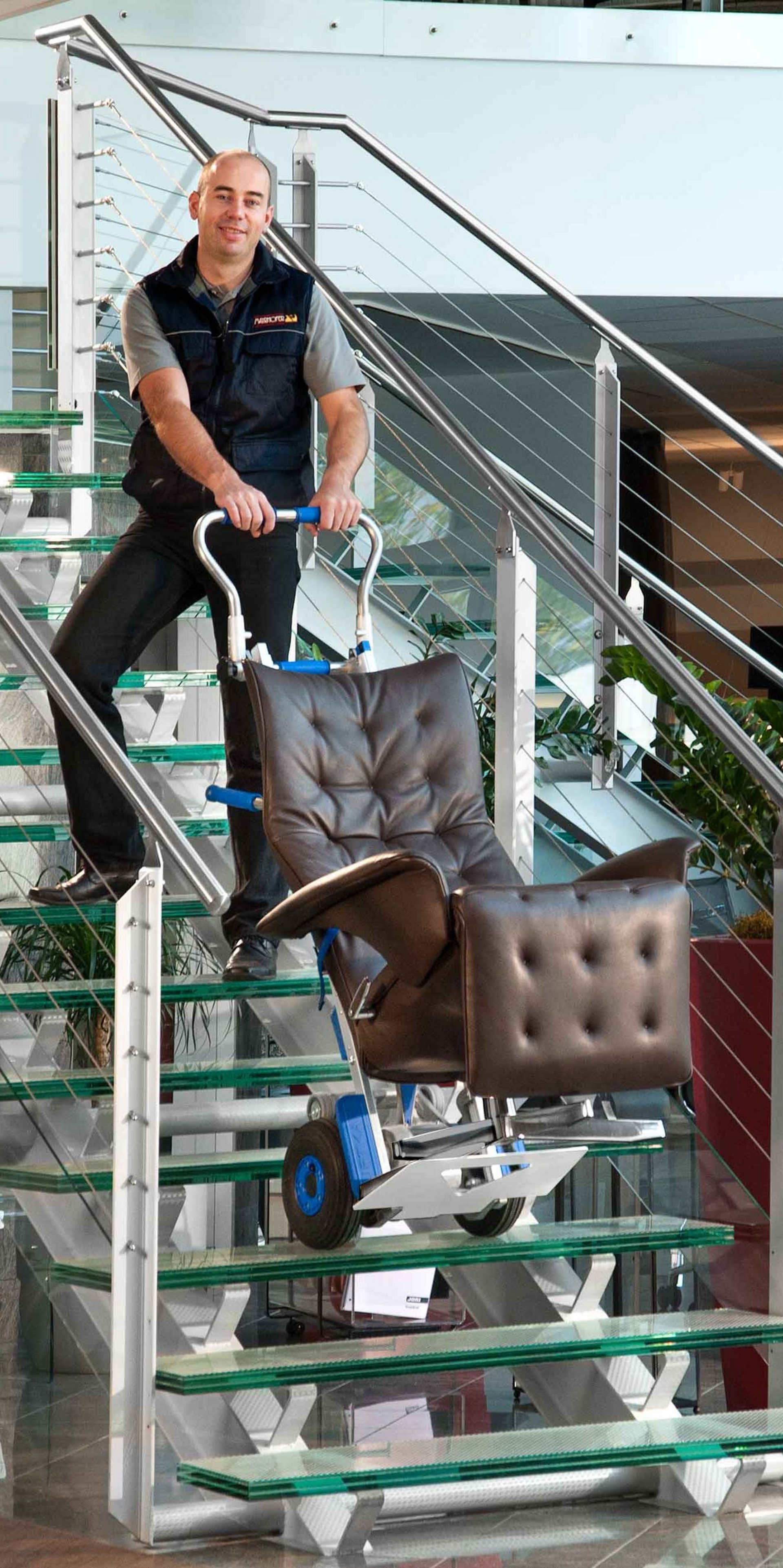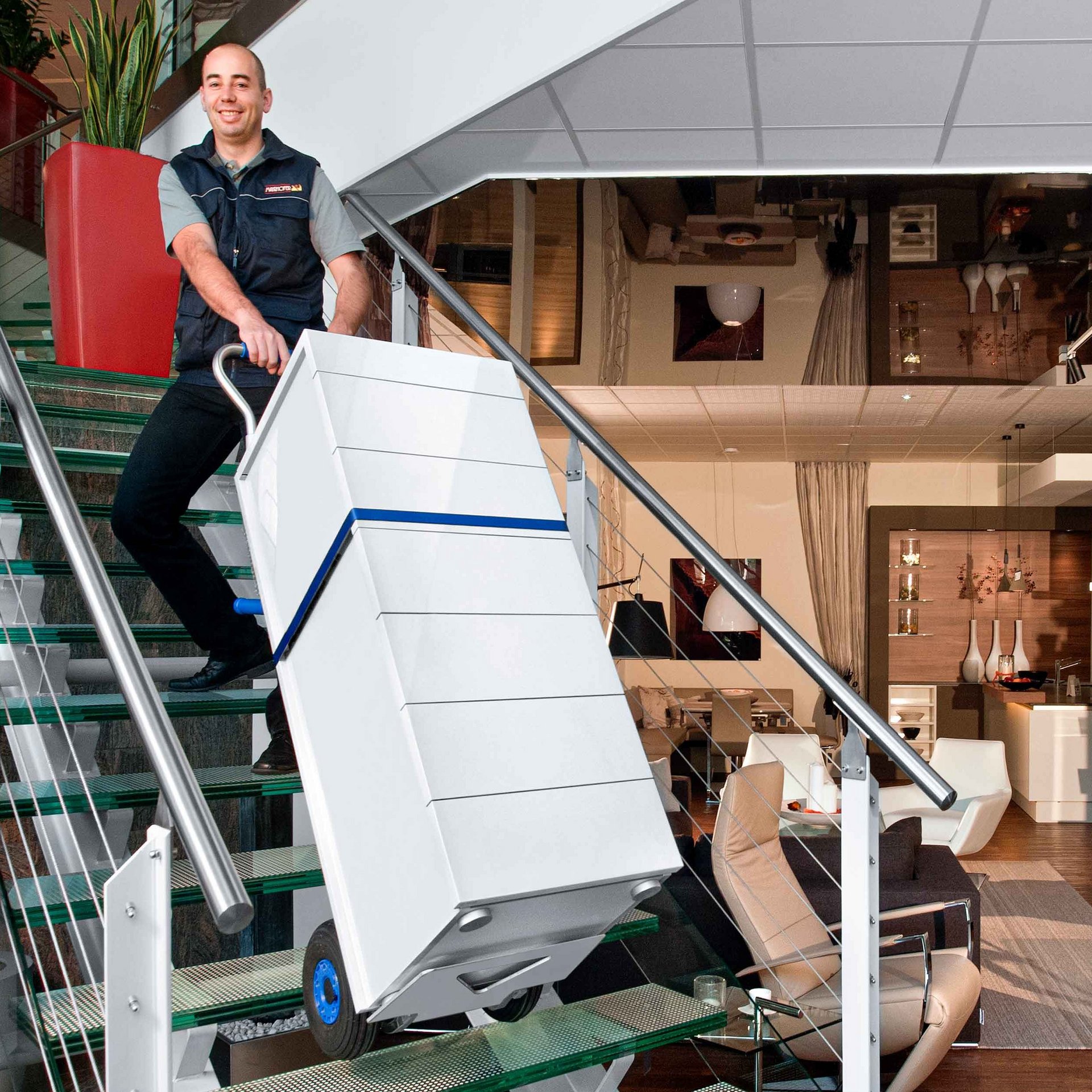 De telles charges peuvent être déplacées sans effort et transportées dans les escaliers, ce qui améliore non seulement l'efficacité au travail, mais protège également le capital le plus important de votre entreprise : "Des employés en bonne santé". Découvrez les performances de notre équipement et optimisez l'ensemble de votre processus de livraison.