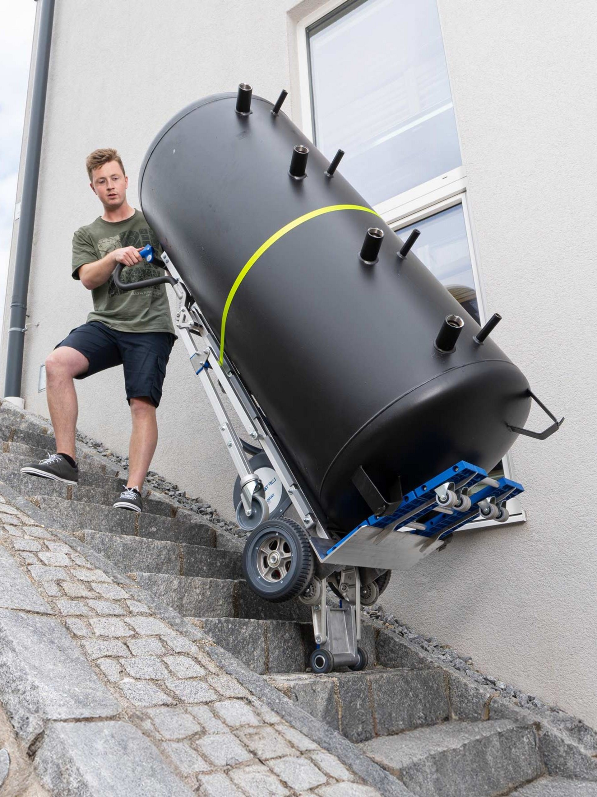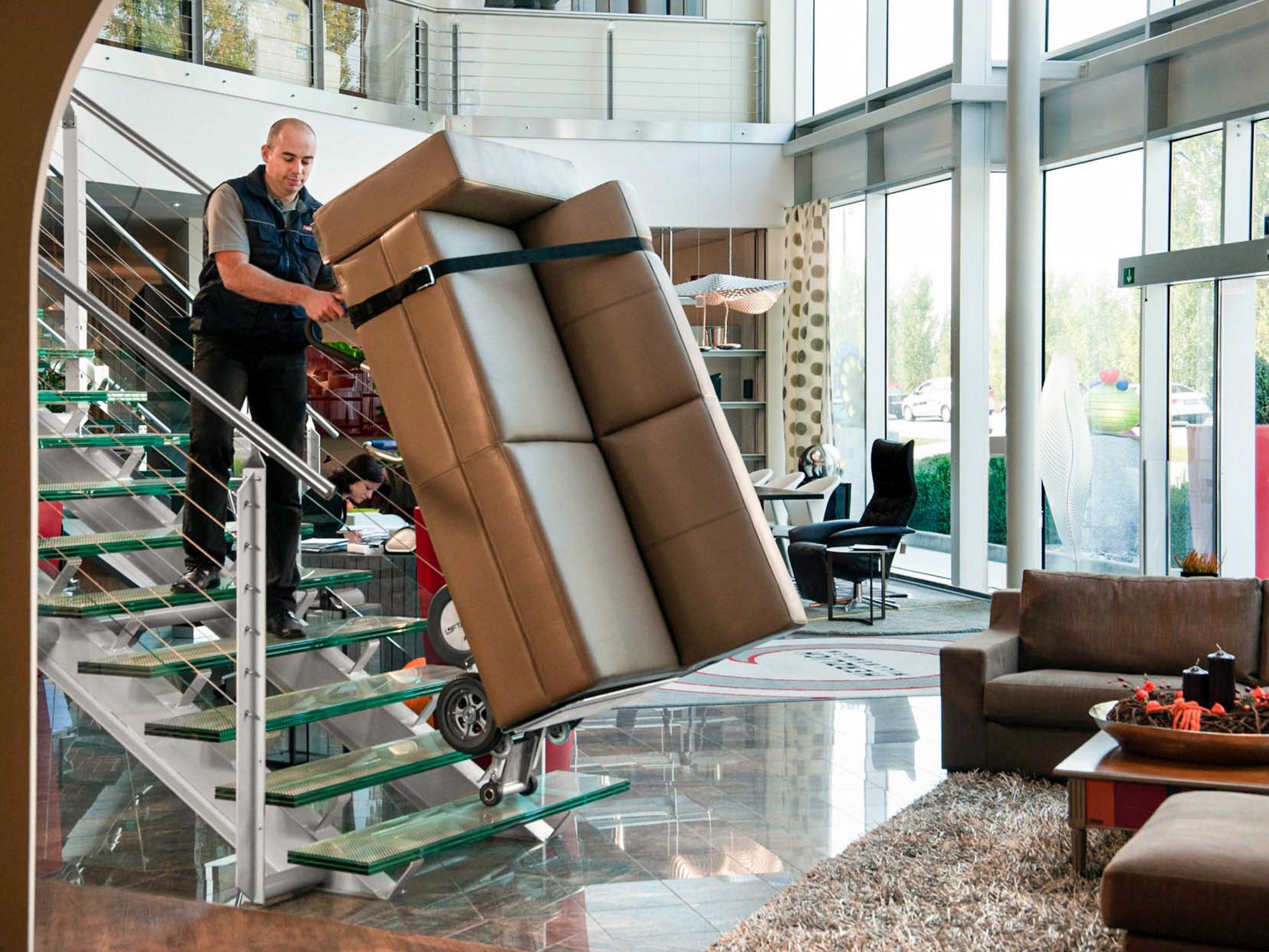 Our product range extends from simple hand carts capable of effortlessly transporting up to 300 kilograms or seven water bottles, to powerful devices that can safely transport loads of up to 360 kilograms up and down stairs. In all our solutions, the focus is on back protection, aiming to create a work environment that is not only efficient but also motivating, providing your employees with a fulfilling working life.